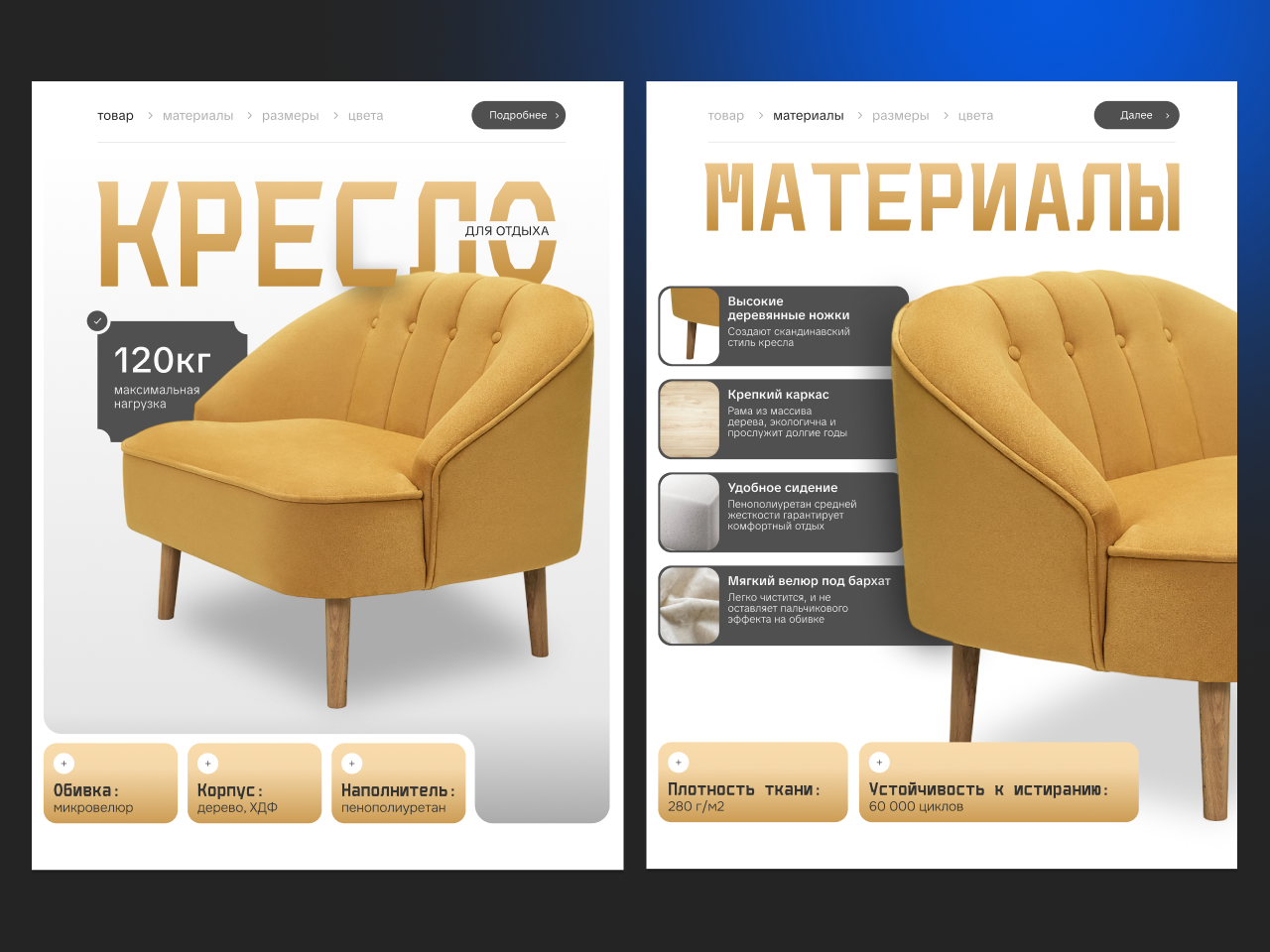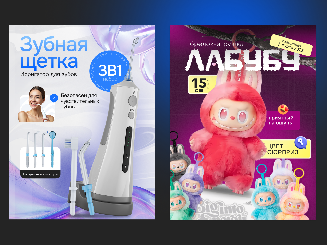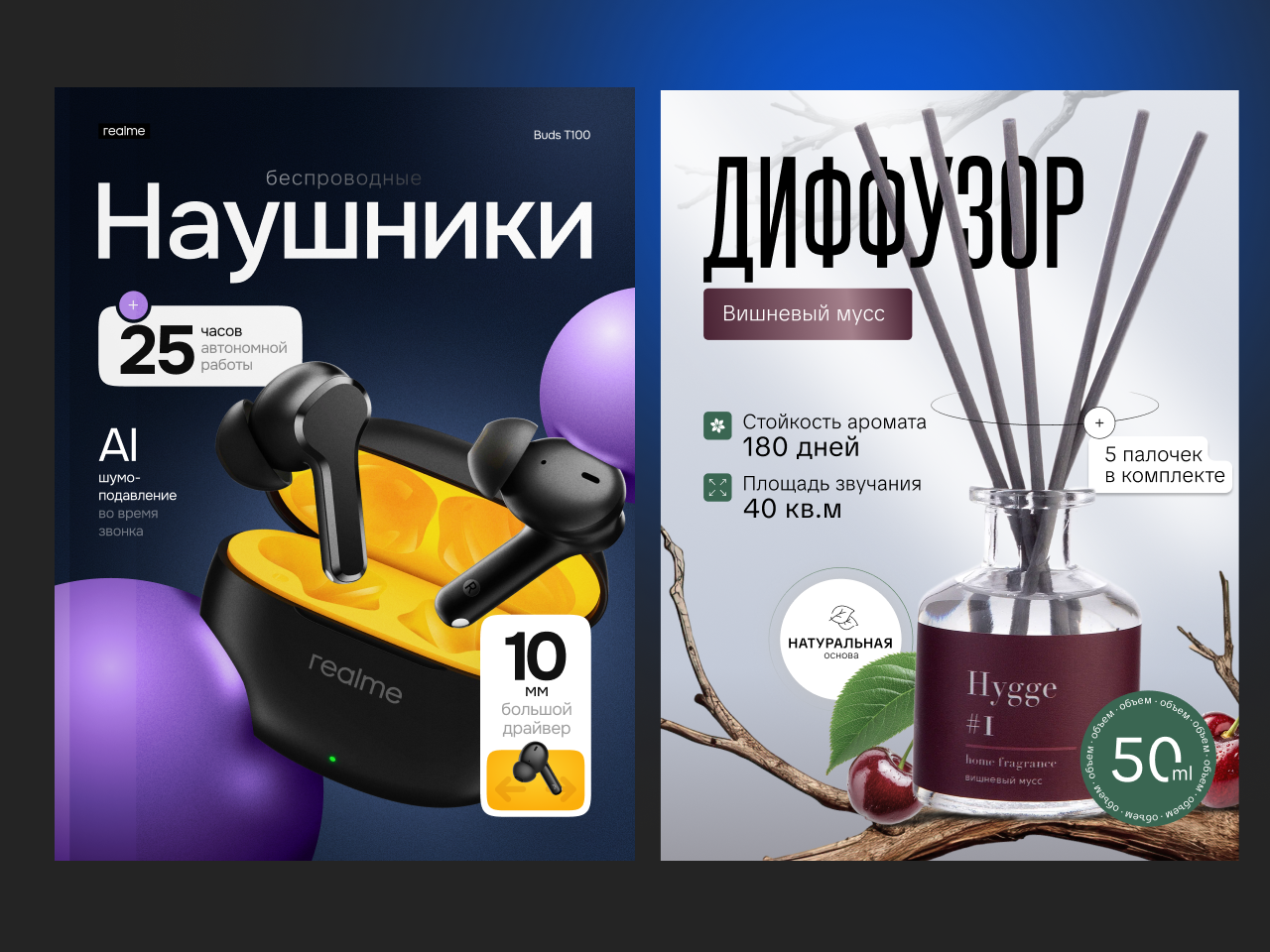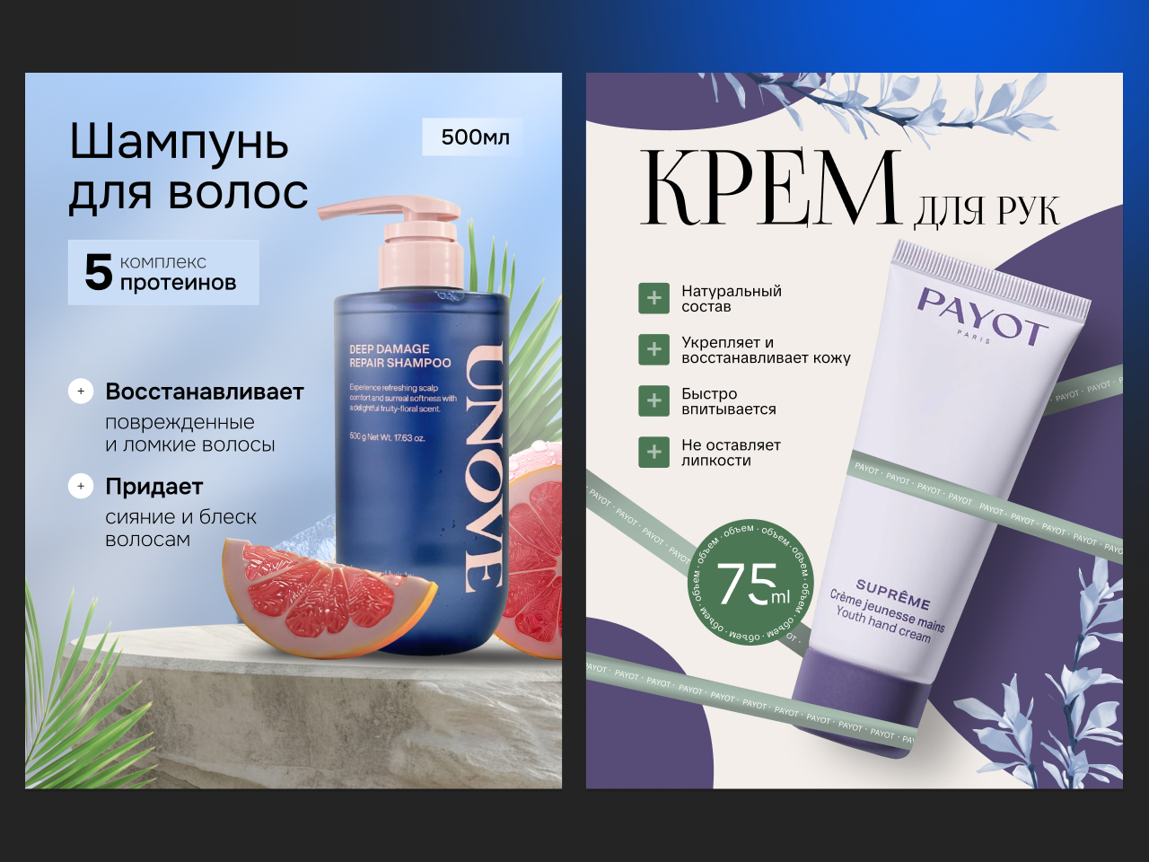 Разработка инфографики для карточек товара на маркетплейсах. Основная задача — наглядно и лаконично представить преимущества и характеристики продукции, сделать информацию понятной для покупателя и при этом сохранить стиль бренда. В работе использованы иконки, структурированные блоки и фирменные цвета. Дизайн адаптирован под формат маркетплейсов и мобильных устройств, что повышает привлекательность карточки товара и конверсию.