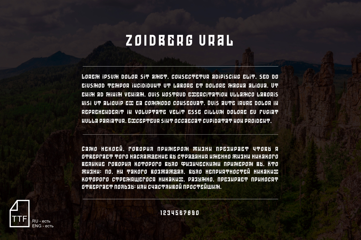 Результатом стал полноценный файл шрифта авторской разработки. Содержащий кириллицу и латиницу, строчные и прописные буквы, цифры и служебные символы. Результат это плотный, декоративный шрифт отлично подходящий для тематического оформления, создания логотипов и решения других графических задач.