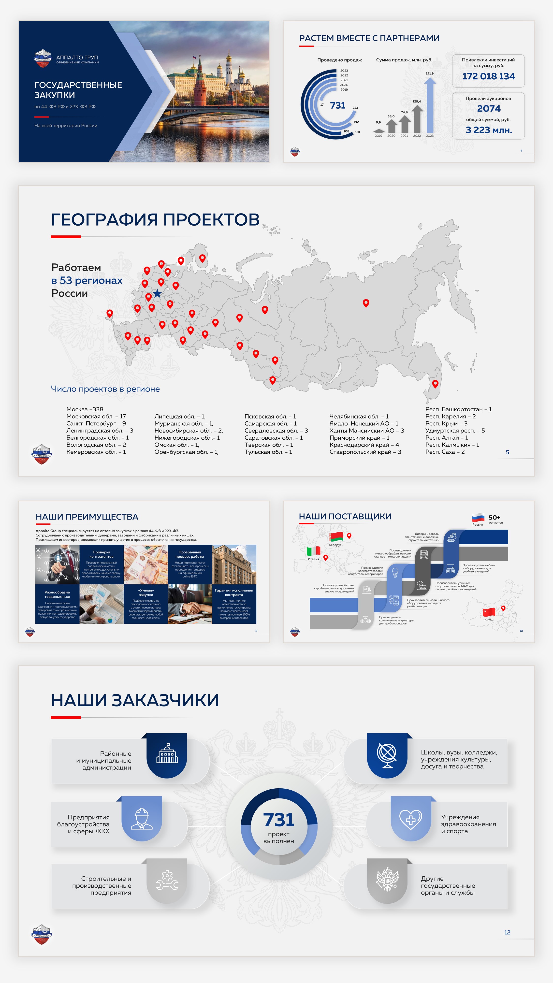 Дизайн презентации должен был отражать солидный опыт, респектабельность компании и ее направленность на посредничество между гос.организациями и поставщиками товаров/услуг в рамках госзакупок. Клиент предоставил старую презентацию, сделанную силами его сотрудников и дополнительные материалы в текстовом виде.