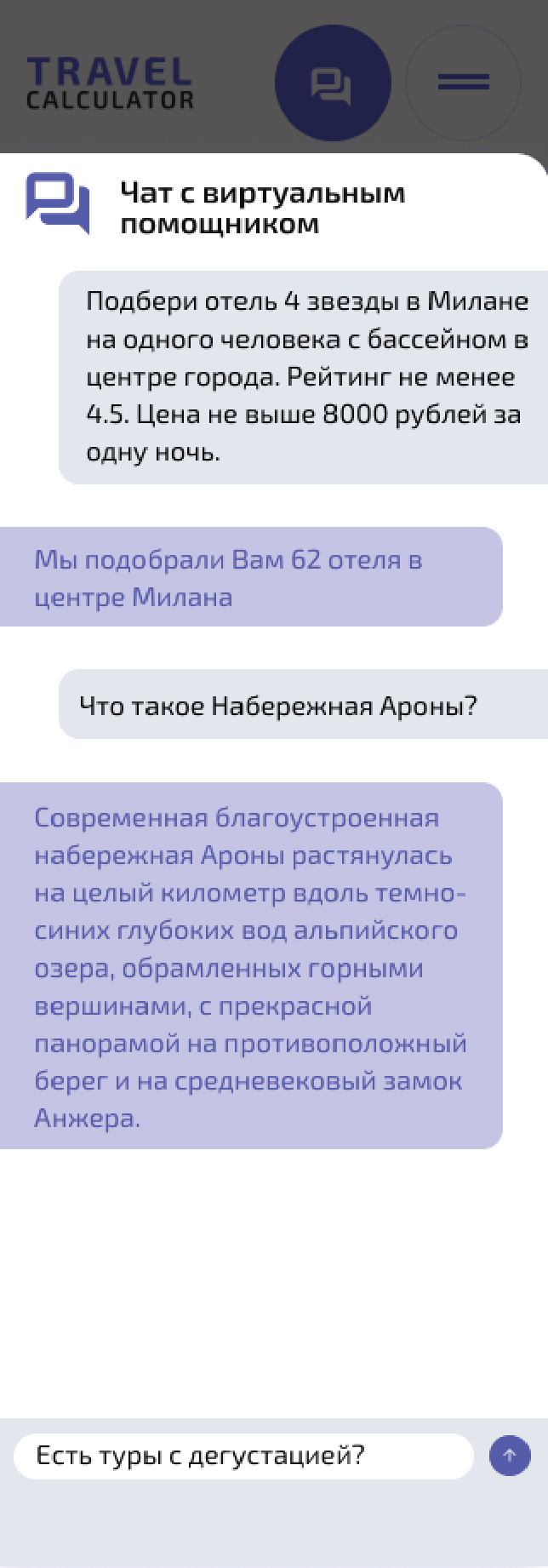 Помимо карточки путешествия, в рамках проекта я также работал над дизайном чата с виртуальным помощником. Чат стал полезной функцией, позволяя пользователям быстро получать ответы на вопросы и оформлять бронирования в режиме реального времени.