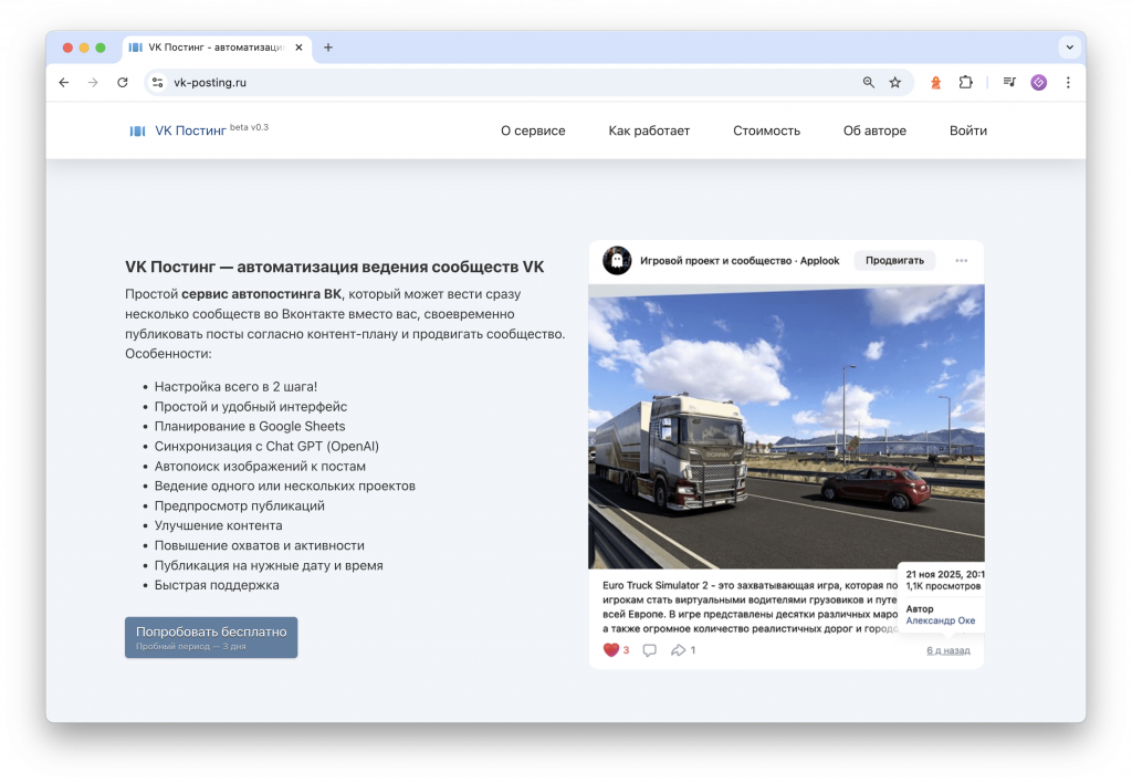 Разработка сервиса автопостинга для ведения групп и сообществ социальной сети Вконтакте. Сервис имеет платные тарифы — 3шт., каждый из которых ограничивает кол-во подключаемых сообщество для ведения. Работает с VK API, авторизацией ID.VK. Синхронизируется с OpenAI Chat GPT и таблицами Google Sheets.