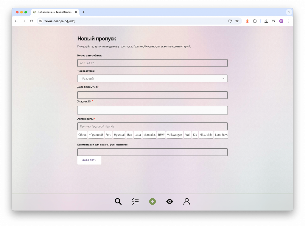 Добавление пропусков для автомобилей;