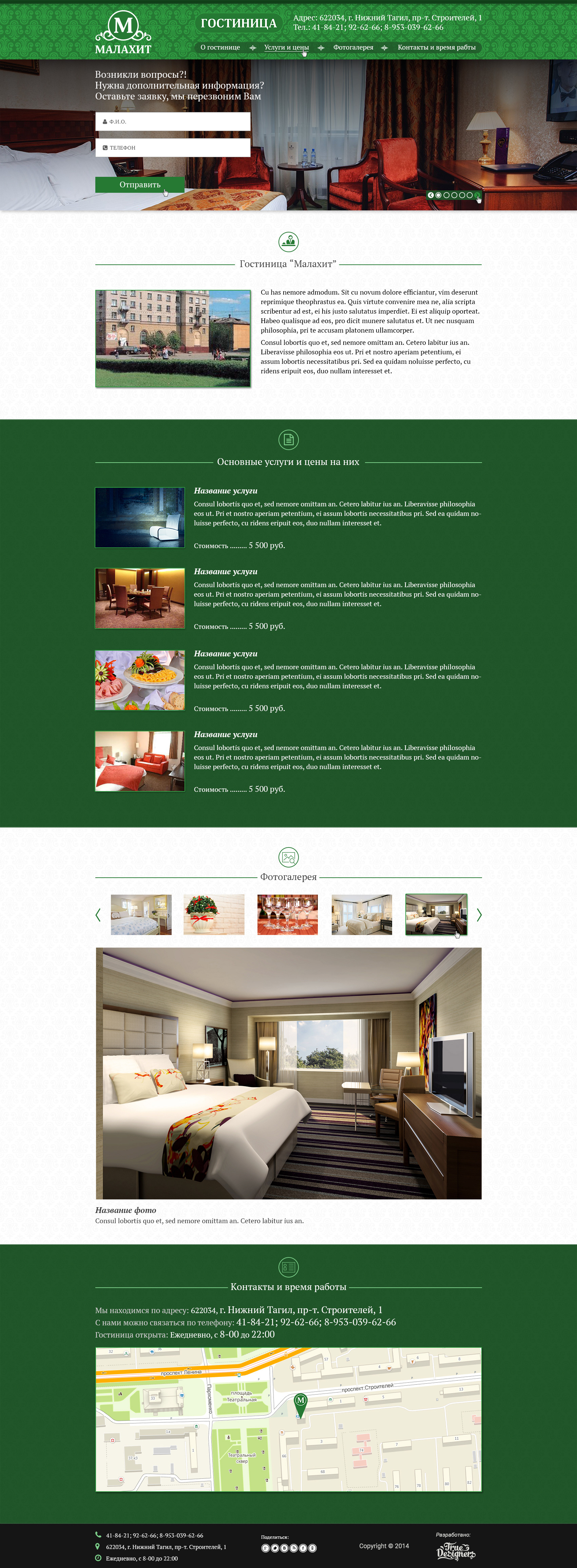 Разработать дизайн сайта, отражающий уникальные черты гостиницы "Малахитовая" (например, цветовую гамму, шрифты, стиль фотографий).