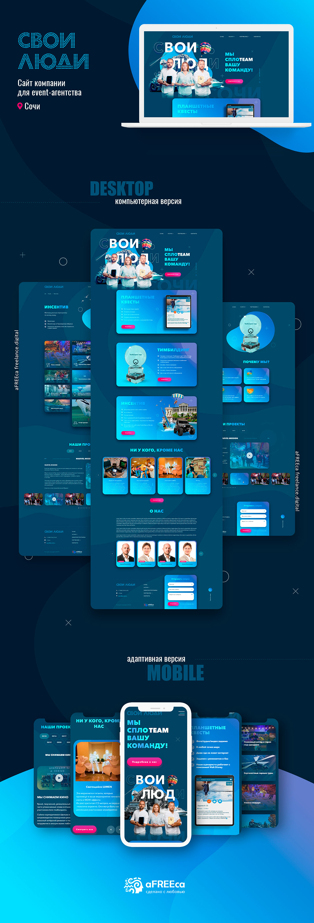 СВОИ ЛЮДИ — это яркая и талантливая команда, собравшая людей из разных городов и стран: Новосибирск, Москва, Владивосток, Красноярск, Сочи, Рига, Тверь, Ташкент.