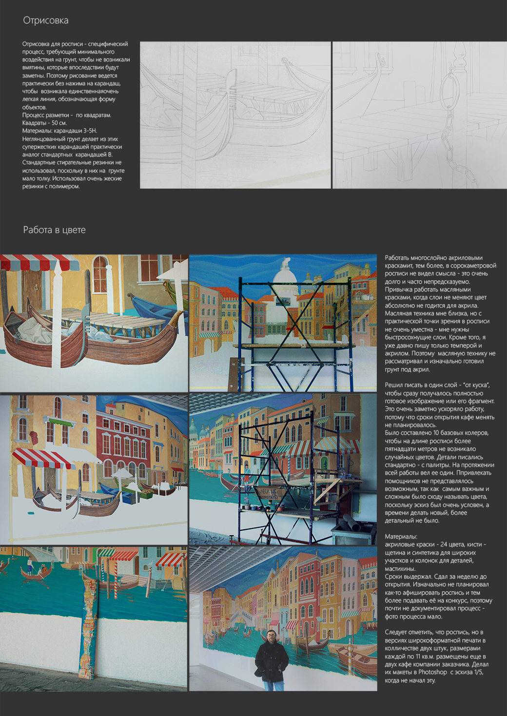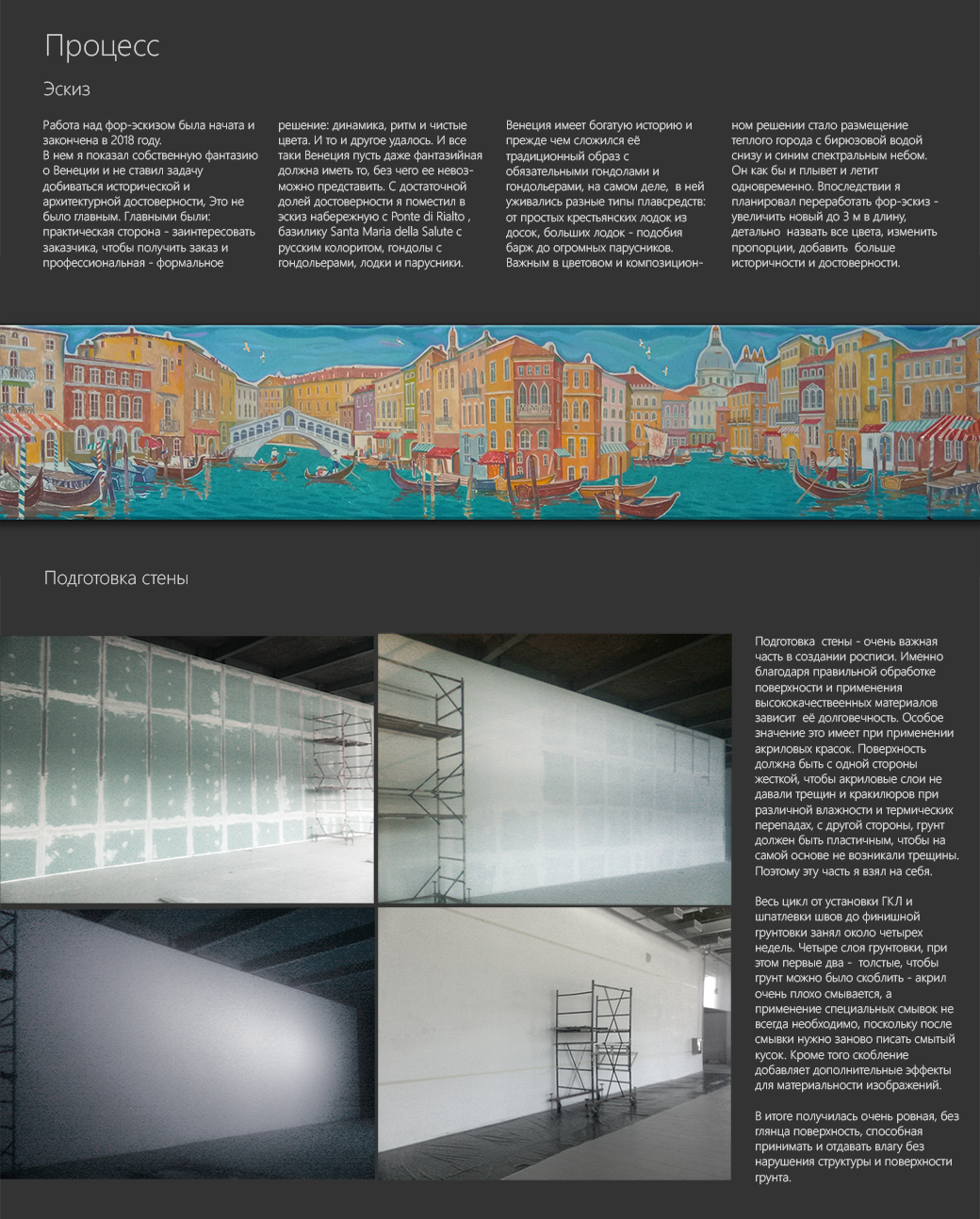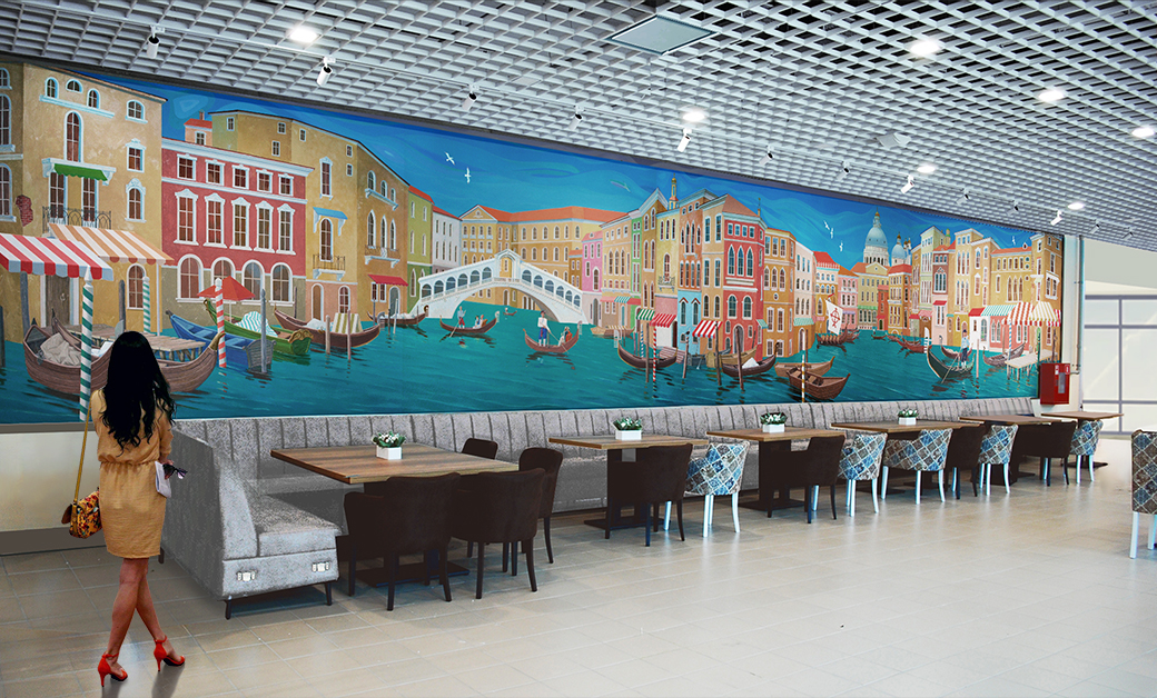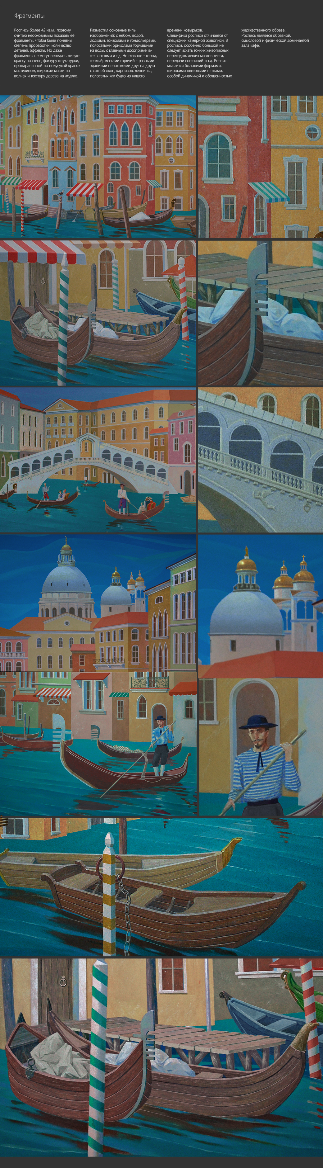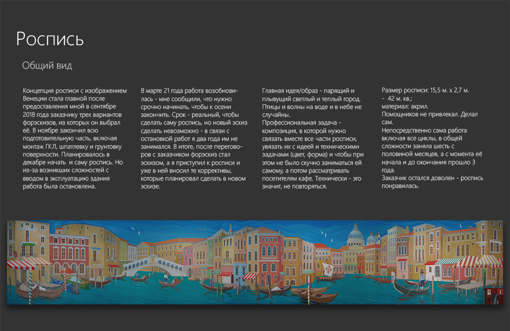Концепция росписи с изображением Венеции стала главной после предоставления мной в сентябре 2018 года заказчику трех вариантов форэскизов, из которых он выбрал её. Главная идея/образ - парящий и плывущий светлый и теплый город. Птицы и волны на воде и в небе не случайны. Профессиональная задача - композиция, в которой нужно связать вместе все части росписи, увязать их с идеей и техническими задачами (цвет, форма) и чтобы при этом не было скучно заниматься ей самому, а потом рассматривать посетителям кафе.
